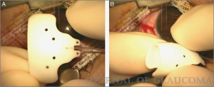 The plate is low-lying and made up of flexible material allowing easier insertion in patients with tight orbits or childhood glaucoma patients with buphthalmos and relatively small orbits (Figure 3). The anterior position of the suture fixation eyelets allows easier implant fixation without the need for extensive posterior dissection. The device is packaged with an optional pre-threaded 4/0 polypropylene ripcord suture and a 23-gauge needle which is used to create the sclerostomy. The ripcord suture is usually removed in the pediatric population because of the difficulty of removing it in the clinic postoperatively.