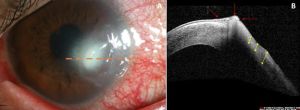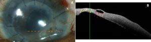 Corneal perforations are ocular emergencies that can occur secondary to penetrating trauma in healthy corneas or mild insults in those with active or prior keratitis with associated stromal thinning. These patients may also have shallow/flat anterior chambers with aqueous egress (Seidel positivity). While detectable by slit lamp examination in most cases, AS-OCT can be used to assess areas which may be suspicious or difficult to view through areas of corneal haze with stromal thinning. Figure 9 demonstrates corneal thinning in a patient who had a prior penetrating keratoplasty for corneal perforation. AS-OCT shows a sub-epithelial cystoid change. Figure 10 depicts an area of ectasia found to be Seidel positive. The corresponding AS-OCT image highlights the posterior corneal ectasia with a focal tract and excavation leading to the ocular surface.