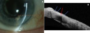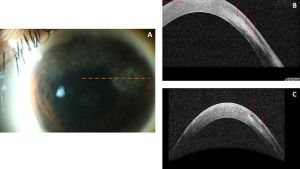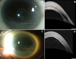 Particularly in corneas with dense infiltrates and significant corneal edema, the depth of involvement may be difficult to ascertain on slit lamp biomicrosopy. AS-OCT allows for the monitoring of the depth of corneal involvement and corneal thickness. For instance, in fungal keratitis, AS-OCT have been demonstrated to help detect satellite lesions and necrotic spaces.[10]