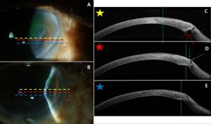 Optical coherence tomography (OCT) was initially developed for imaging and analyzing the macula and optic nerve, but it is also being utilized to image the ocular surface and anterior segment of the eye.[1] Anterior segment OCT (AS-OCT) produces high-resolution cross-sectional images in a quick and noninvasive manner creating an “optical biopsy” of various anterior segment structures.[1] AS-OCT provides information about structural changes predominantly: infiltrates and scars appear as hyper-reflective lesions within the corneal stroma, inflammatory plaques as hyper-reflective lesions over the endothelium or epithelium, corneal edema as increase in corneal thickness, and stromal necrosis as cystic spaces within the stroma.