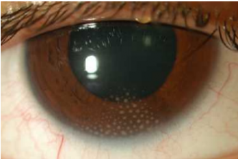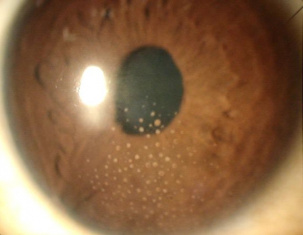 However, in some cases, this collection of sticky inflammatory cells on the central and inferior cornea is so large in size, that it's visible with the naked eye.