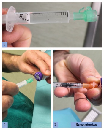 Two mL of balanced salt solution (BSS) are injected into the bottle containing 50 - 100U of botulinum toxin to obtain 5U per 0.1 mL (figure 3).