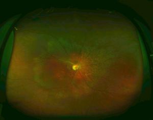 Maculopathy is perhaps the most striking and impairing feature of ocular disease in early-onset CblC disease. Macular changes can develop as early as 35 days of age, often as subtle macular pigmentary or atrophic changes.[90] These macular changes may progress to severe macular lesions in a dramatically fast pace compared to other inherited maculopathies, usually within the first two years of age but as early as 6 months of age.[20][84][88] Maculopathy is estimated to affect 33% of patients before 1 year of age, 60% at 4 years, and 75-86% of early-onset cases overall.[2][21][41] Severe macular lesions may take the form of chorioretinal atrophy or a bull’s eye maculopathy (a hypopigmented perimacular zone surrounded by a hyperpigmented ring), which can progress to a more atrophic macular appearance.[19][20][21][22][40][80][83][84][85][88][89] For example, one case report described a patient with normal fundus at 6 months of age followed by punched-out macular chorioretinal atrophy detected less than a year later.[20] Sometimes the base of these severely atrophic central chorioretinal lesions can become depressed forming a coloboma-like (or pseudocolobomatous) lesion, described as early as 6 to 8 months of age.[21][22][80][84] A posterior staphyloma superimposed on a coloboma-like lesion has also been described.[20]