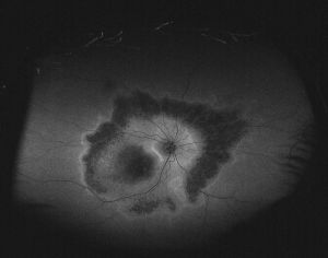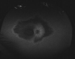 The process of outward expansion of macular lesions is often best characterized with the aid of FAF imaging, which can be a valuable tool in detailing macular and retinal changes. Typical images include a sparing of peripheral retinal fields surrounding mid-peripheral areas of variable hypo- and hyper-autofluorescence. The macular region is hypoautofluorescent (characteristic of atrophic regions) and is surrounded by perimacular ring of hyperautofluorescence (owing to photoreceptor degeneration), indicating progressive and expanding geographical atrophy. It is of note that the peripapillary regions are often spared, as is the case in other retinal degenerations such as in Stargardt disease, and in correlation with OCT findings described below.[20][41]