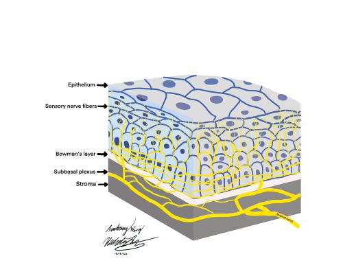 As the optically transparent, avascular, and most anterior portion of the eye, the cornea is responsible for two thirds of the eye’s total refractive power. The cornea is one of the most densely innervated structures in the body with approximately 7,000 nociceptors per square millimeter, giving rise to sensitivities 40 times greater than tooth pulp and 400-600 times greater than skin. [1][2] Innervation to the cornea originates from the first division (V1 - ophthalmic branch) of the trigeminal nerve, distally traveling in the nasociliary nerve and long ciliary nerve branches and ultimately dividing into fibers that invade the stroma [3]. These nerve branches then run parallel to the layers of the cornea between Bowman’s layer and the basal epithelium to form a nerve plexus known as the subbasal nerve plexus.
