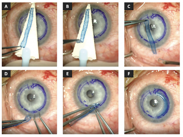 Hydrated segments maintain their natural flexibility and native thickness, allowing for gentle conformity to the corneal curvature. However, this pliability can make insertion more technically challenging, as the segments may fold or twist within the tunnel.[14] Improper orientation during insertion can also lead to malalignment of corneal layers, particularly if the segment is inadvertently placed upside down. To mitigate this, one technique involves marking Bowman’s layer with a sterile surgical marker immediately after excising the deepithelialized corneal tissue.[4]