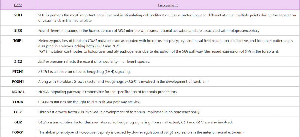 SHH[8], SIX3[9], TGIF1[10][11], ZIC2[12], PTCH1[13], FOXH1[14], NODAL[15], CDON[16], FGF8[17], GLI2[18], FOXG1[19]