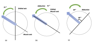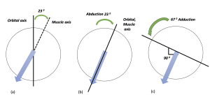 The oblique muscles form an angle of 51°with the visual axis, as shown in Figure 9. When the globe is 51° adducted, the visual and the orbital axis align, and the oblique muscles act as pure elevators/depressors. In 39° abduction, the visual axis and the orbital axis are at 90° to each other, and the oblique muscles work as pure torsional muscles.[44]