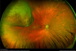 Choroidal Melanoma By Karen Panzegrau. Ultra-wide field Optos image of a 27-year-old male patient who presented with loss of vision for about 6-8 weeks. Previous choroidal nevus seen. Recommended annual monitoring. No exam for since 10/2014. Brachytherapy vs enucleation was discussed. Brachytherapy was decided as treatment. Full metastatic work up is being performed. - Choroidal Osteoma
