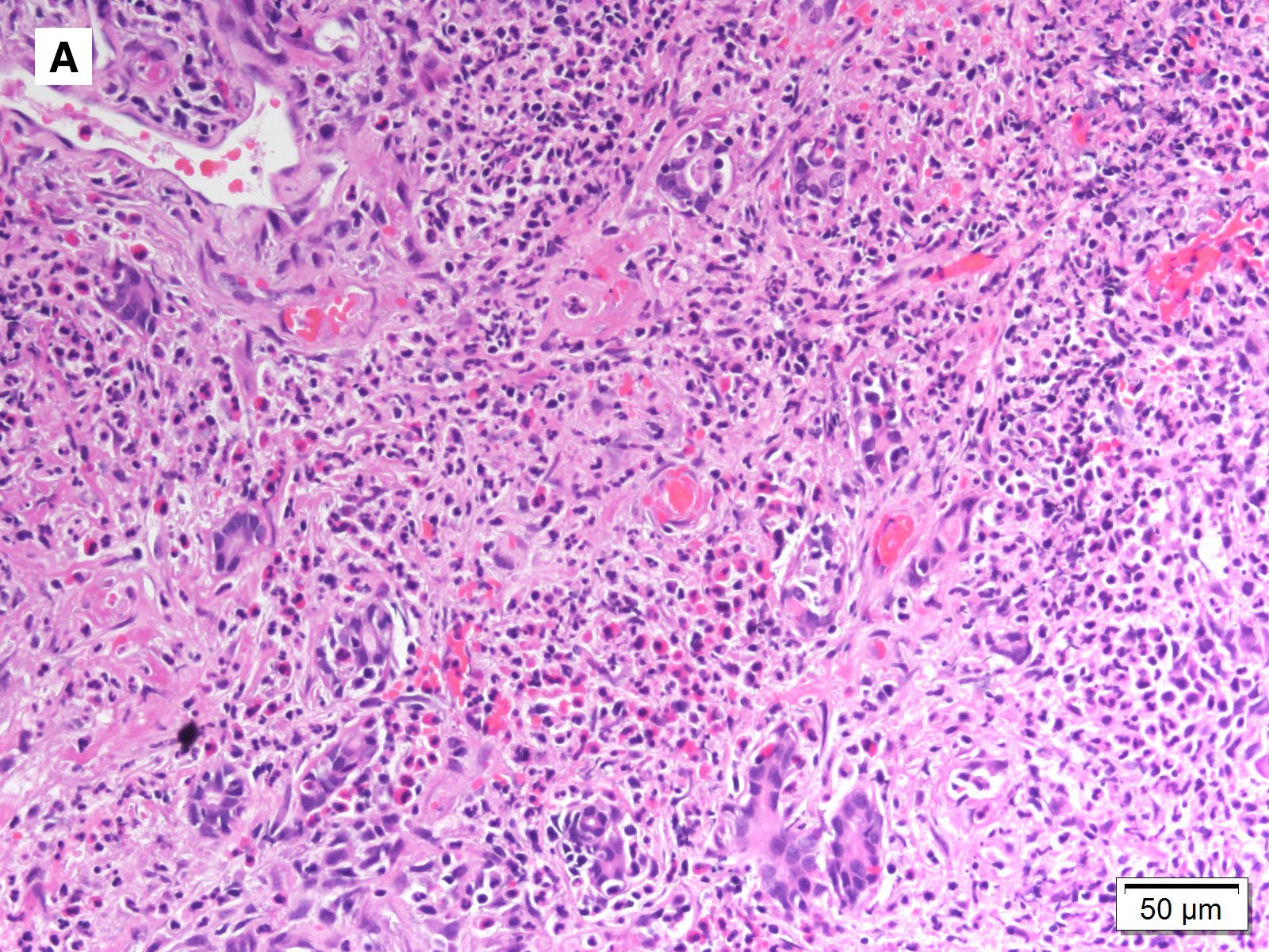 Histopathologic examinations of angiolymphoid hyperplasia with eosinophilia that reveals fibrovascular tissue infiltrated with chronic inflammatory cells and abundance of plasma cells. Also, hyperplasia of the small arterioles and venules surrounded by numerous eosinophils; hematoxylin–eosin stain.