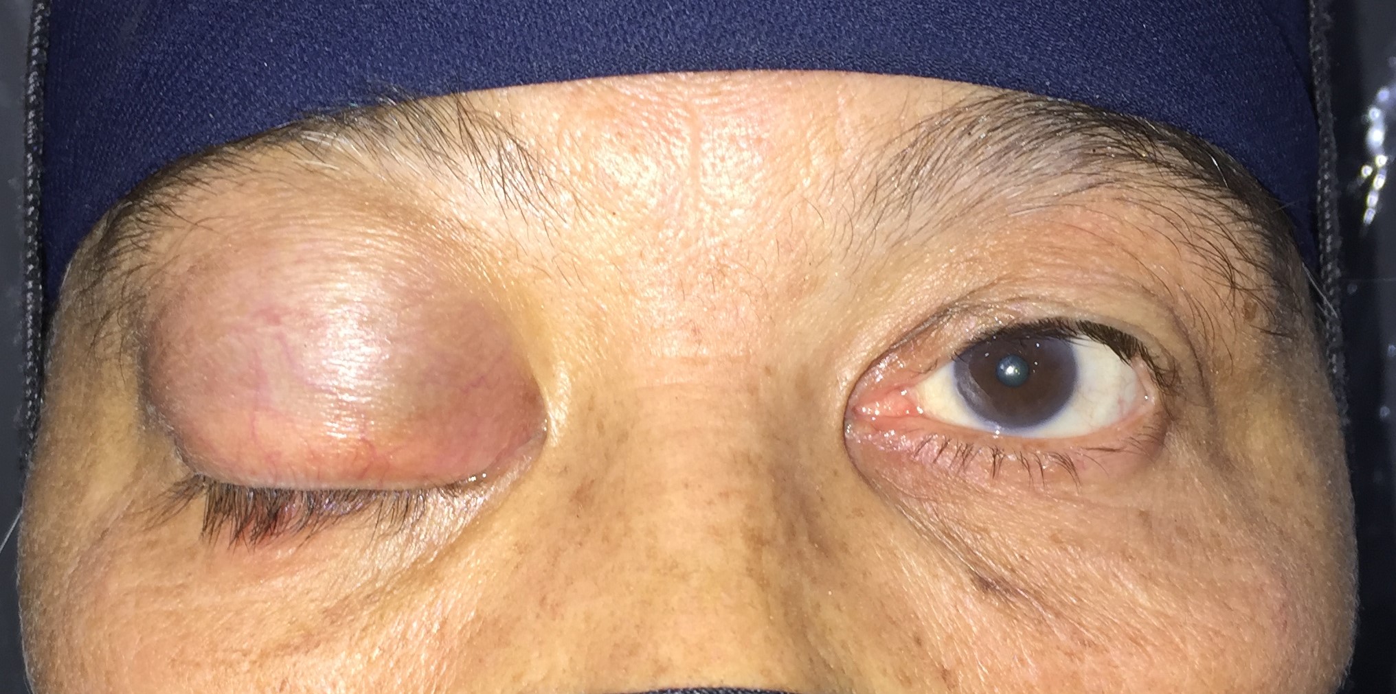 A huge WGDC of the right upper eyelid with complete ptosis.