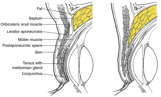 | current | 11:57, December 8, 2021 | 518 × 312 (151 KB) | Anne.Kutzscher (talk | contribs) | Figure 1: Anatomical variation of the upper eyelid. Eyelid morphology I (left): the orbital septum and levator aponeurosis fuse superior to the tarsus. Fibrotic bands from the levator aponeurosis attach to the pretarsal orbicularis muscle, subcutaneous tissue, and skin. Eyelid morphology II (right): the fusion site of the orbital septum and levator aponeurosis occurs at a lower position, below the superior border of the tarsus. Fewer fibrotic bands from the levator aponeurosis attach to the... |