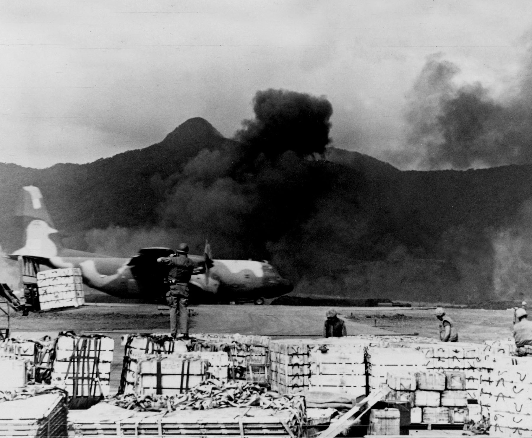 A U.S. Air Force C-130 Hercules takes off from Khe Sanh, Vietnam, in 1968.Photo By: Air Force photo VIRIN: 091029-F-1234O-001 https://www.defense.gov/News/Feature-Stories/story/Article/3291950/highlighting-history-how-tet-began-the-end-of-vietnam/