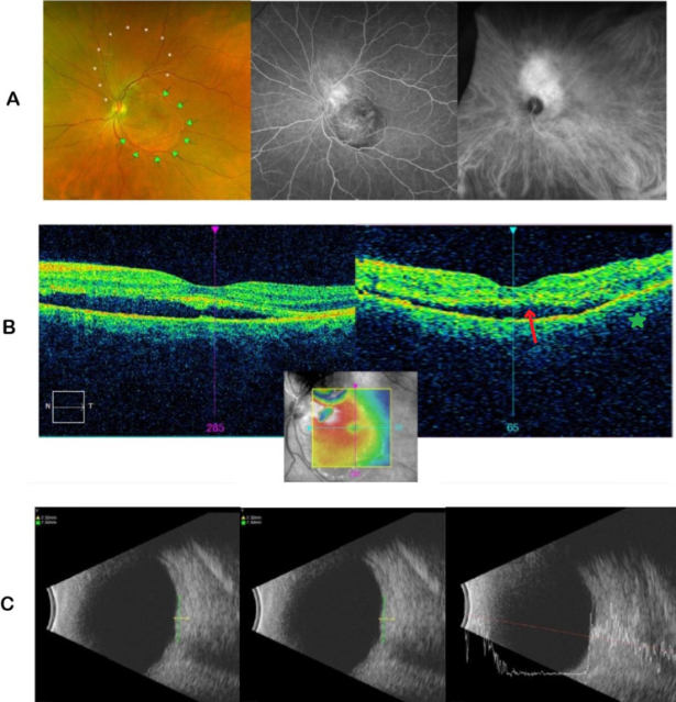 Choroidal Hemangioma: (A) shows fundus photo (left), FA(middle), and ICGA (right). FA revealed leakage from an ill-defined lesion superotemporal to the disc, while the ICGA showed diffuse and intense hypercyanescence of choroidal vessels, consistent with a choroidal hemangioma. (B) shows OCT of the same eye with foveal detachment and choroidal elevation (star). (C) B-scan ultrasonography and A-scan ultrasonography. A Masquerade Case: Choroidal Hemangioma Misdiagnosed As Central Serous Retinopathy © 2023 by Lai L, Javier T, Lee S, Gallemore RP. is licensed under Creative Commons Attribution – Non-Commercial (unported, v3.0) License.