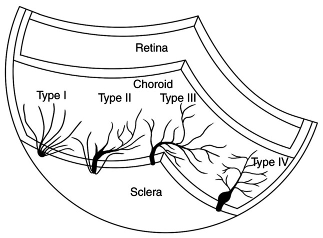 Type I (Vortex Vein Absent): Tributaries pass directly through the sclera instead of forming vortex veins. Type II (Incomplete): Incomplete vortex veins arise where tributaries pass through the sclera alongside the vortex veins. Type III (Complete): Complete vortex veins are observed, where all tributaries join before passing through the sclera. Type IV (Complete with Ampulla): A complete system is formed, where all tributaries join the vortex veins to form an ampulla, which then passes through the sclera.
