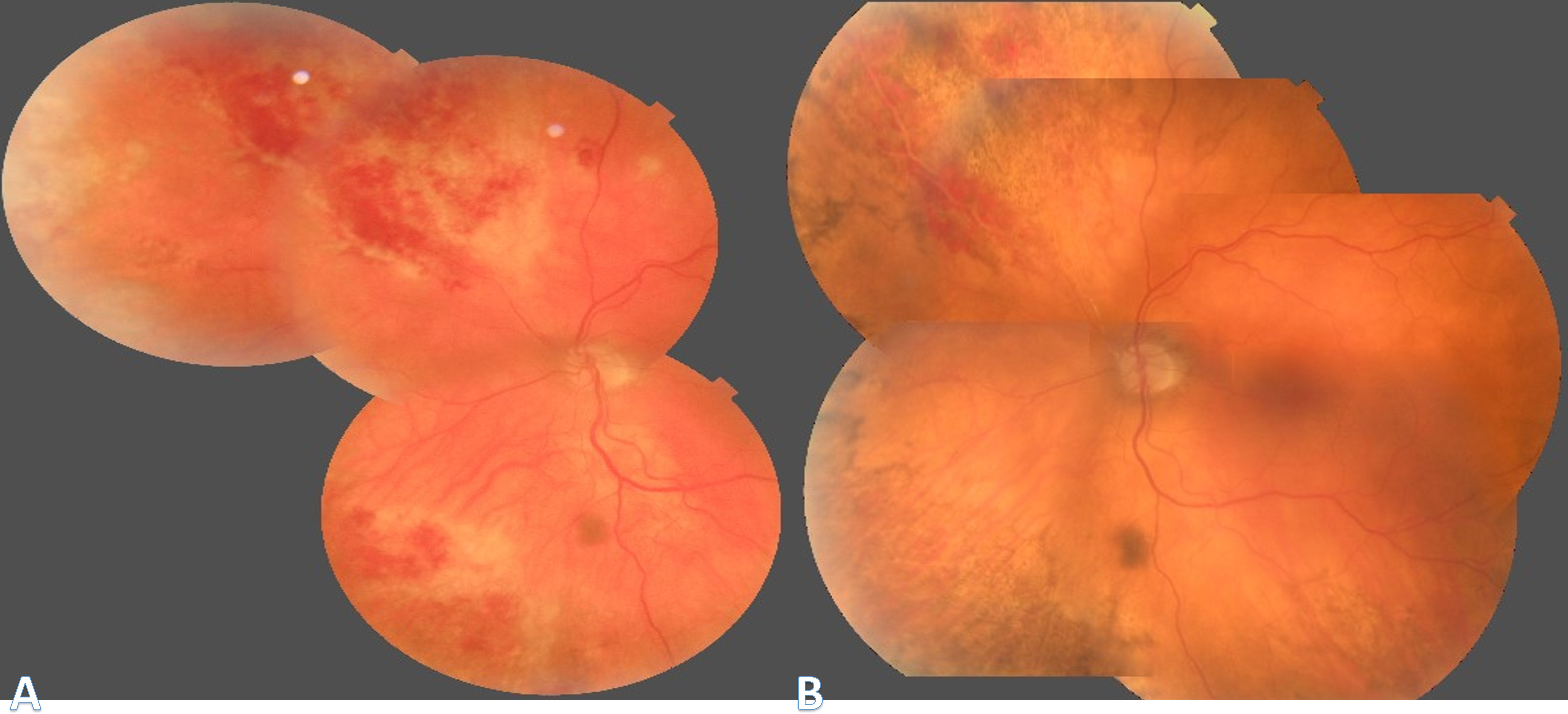 A patient with CMV retinitis (A) who was treated with oral Letermovir and corticosteroid. After one month, there is no new active retinitis, but chorioretinal atrophy is evident (B).