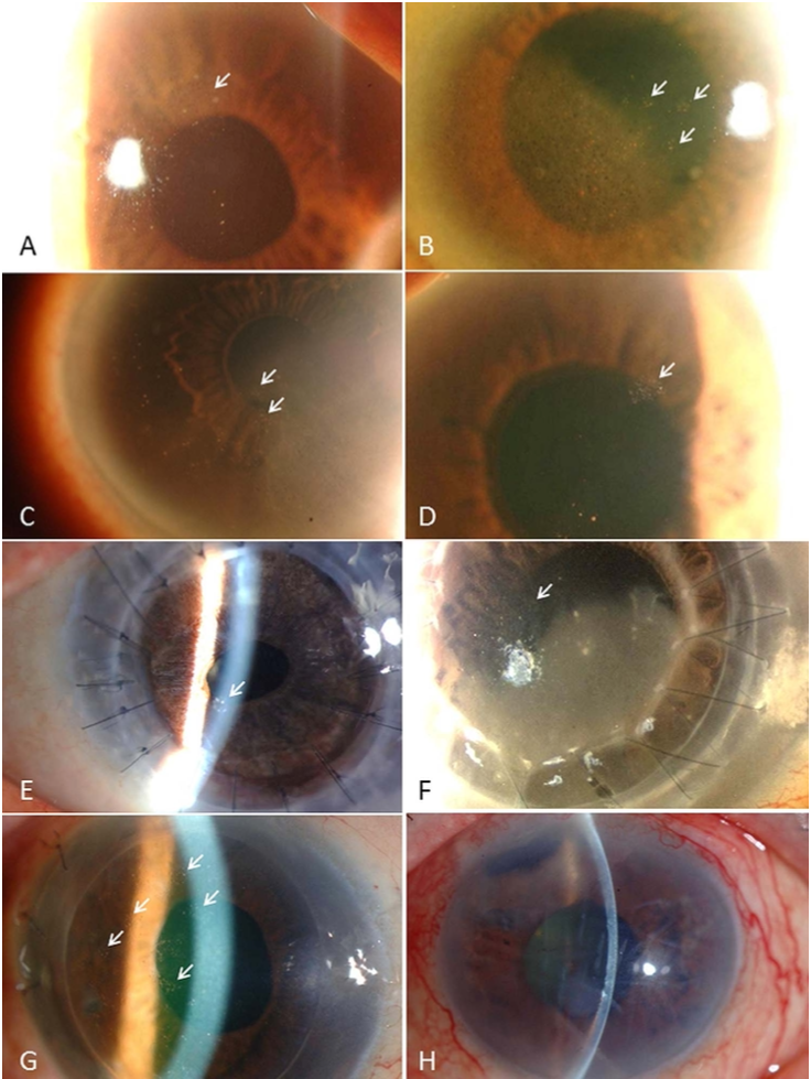 Representative anterior-segment photographs of cytomegalovirus corneal endotheliitis. (A-G) Typical CMV endotheliitis: CMV endotheliitis-associated coin-shaped lesions (white arrows). (H) Atypical CMV endotheliitis: CMV endotheliitis not associated with coin-shaped lesions. This case showed corneal oedema with keratic precipitates associated with recurrent anterior uveitis and secondary glaucoma.