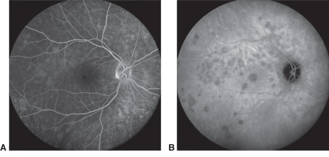 Angiographic images from a patient with multiple evanescent white dot syndrome (MEWDS) using fluorescein (A) and indocyanine green (B) contrast agents. Spots that appear bright on FA and dark on the ICG image. American Academy of Ophthalmology, 2023, Accessed: https://www.aao.org/education/image/indocyanine-green-angiography