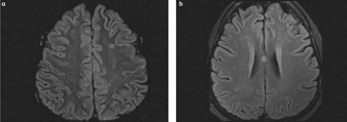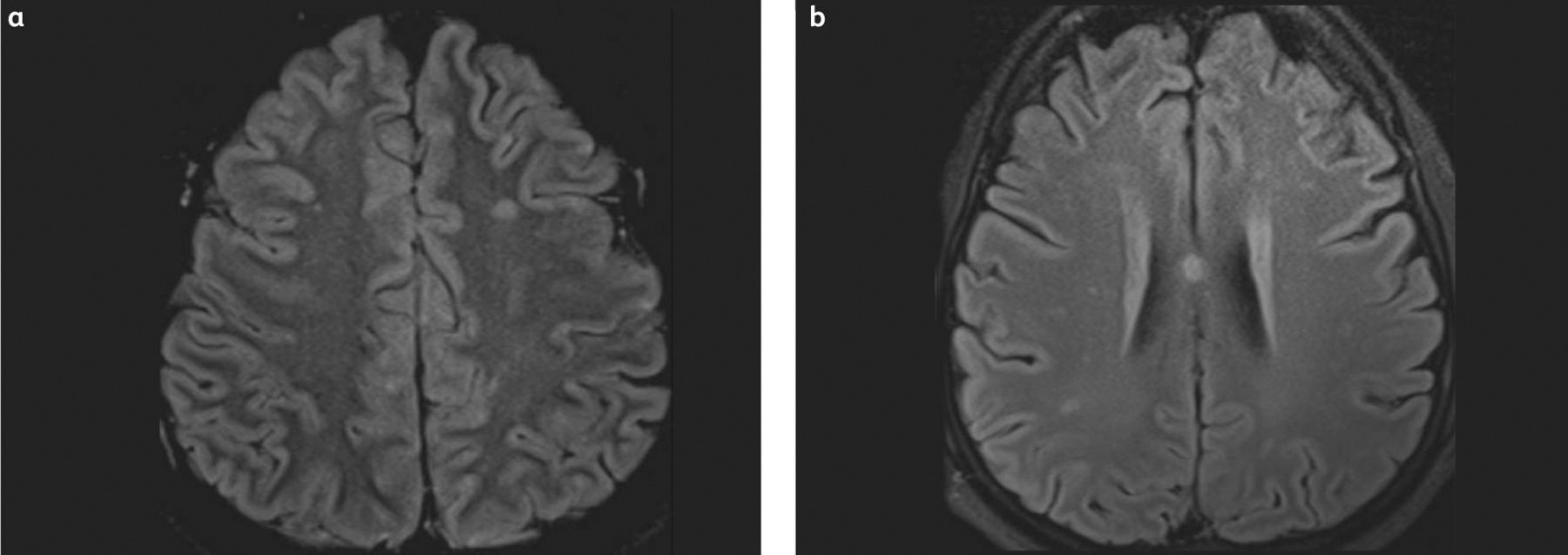 Figure 2: (a) Magnetic resonance imaging using fluid-attenuated inversion recovery shows multiple small bright lesions with areas of cortical involvement. (b) Magnetic resonance imaging using diffusion-weighted imaging demonstrates multiple bright lesions on both sides of the brain. Open access under terms of the Creative Commons License 4.0: https://creativecommons.org/licenses/by-nc-nd/4.0/. Original figures available at: https://doi.org/10.7861/clinmed.2022-0166