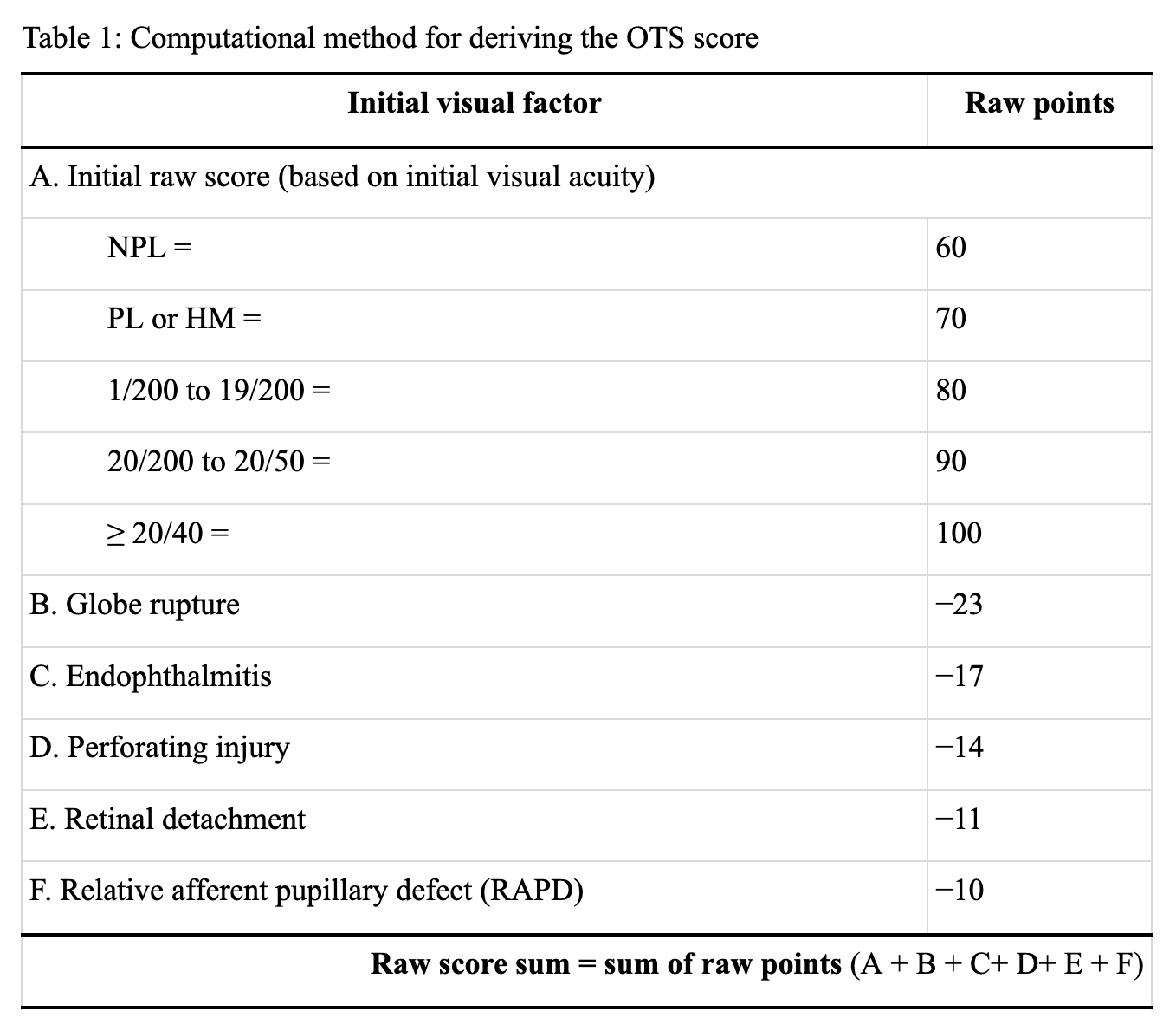 Table of computational method for deriving the OTS score