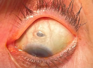 Susvimo implant after insertion. The flange and septum are visible in the supertemporal quadrant.