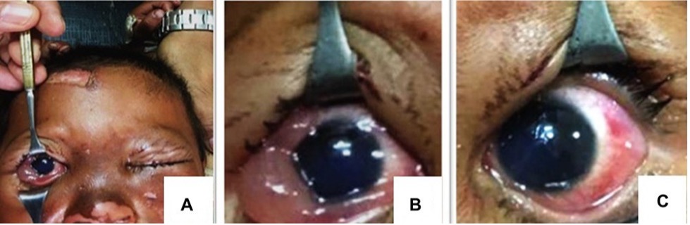 Figure 1: A pediatric patient with (a) first-degree facial burn injuries as well as (b and c) bilateral corneal haze, conjunctival chemosis, and corneal edema.