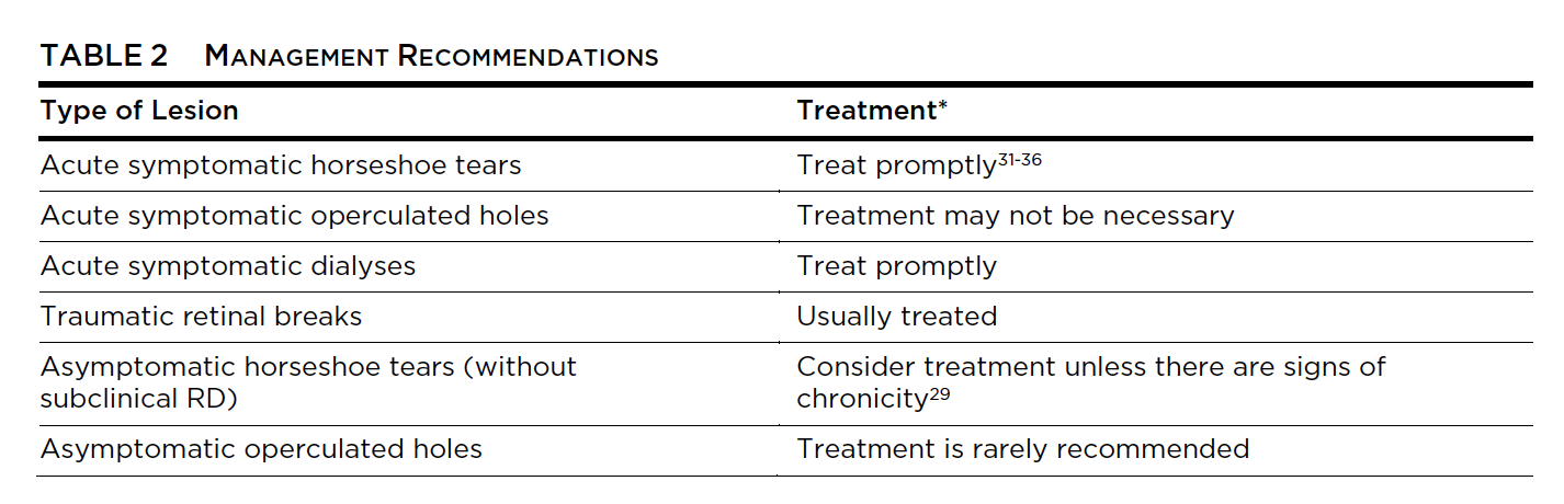 Management options for peripheral retinal lesions, uploaded with kind permission from the American Academy of Ophthalmology. AAO PPP Retina/Vitreous Committee, Hoskins Center for Quality Eye Care. Posterior Vitreous Detachment, Retinal Breaks, and Lattice Degeneration PPP 2024. Available at: https://www.aao.org/preferred-practice-pattern/posterior-vitreous-detachment-retinal-breaks-latti. Accessed September 18, 2025.