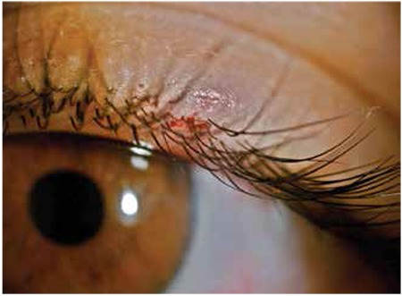 Figure 6. Tick infestation of the superior eyelid. Mild hemorrhage and ecchymosis of the eyelid. The tick's body was severed during an extraction attempt.[1]