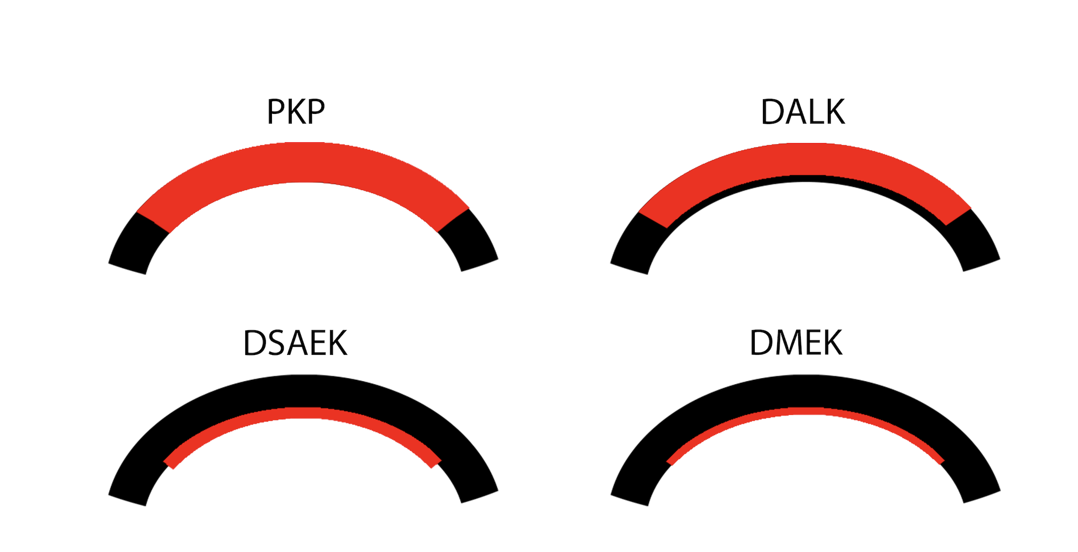 Schematic showing the region of corneal tissue transplanted (red) for various modern keratoplasty techniques https://eyerounds.org/tutorials/cornea-transplant-intro/#gsc.tab=0