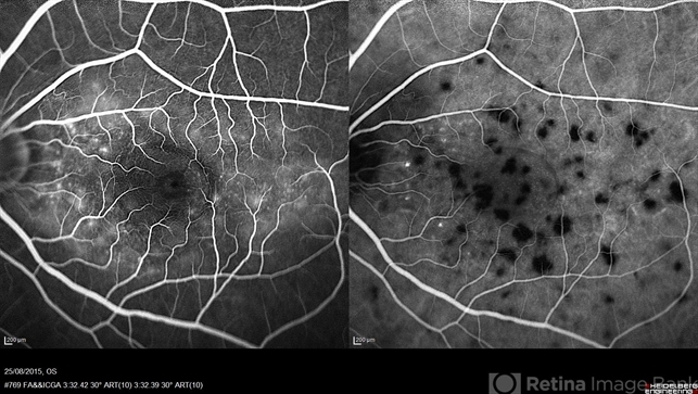 Simultaneous FA + ICGA (early phase) of a 42-year-old woman with VKH showing hypocyanescent dark dots. This image was originally published in the Retina Image Bank® website. Claudia Farinha. Photographer Pedro Melo. Acute Posterior Multifocal Placoid Pigment Epitheliopathy. Retina Image Bank. 2019; 28757. © the American Society of Retina Specialists.