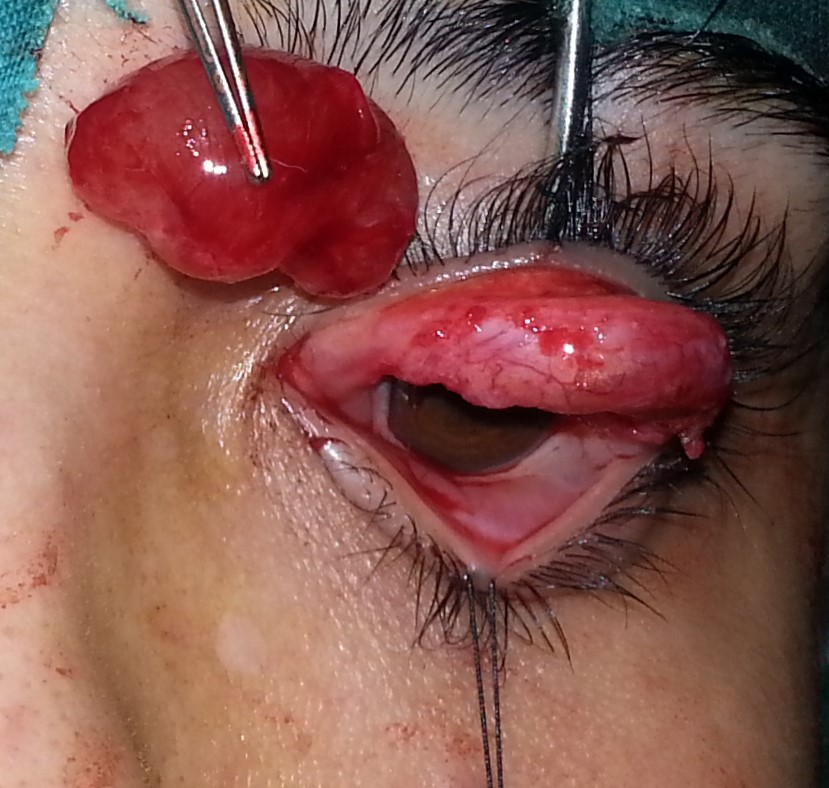 A large WGDC of the left upper eyelid is removed transconjunctivally with an intact wall leaving a large conjunctival defect.