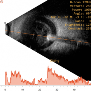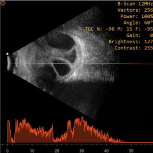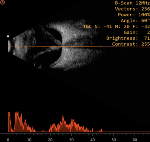 Choroidal detachment on B-scan typically appears as a smooth, thick, dome-shaped membrane in the periphery with little after-movement on kinetic evaluation. On A-scan, at tissue sensitivity, a thick, steeply rising 100% high spike is produced, which on low sensitivity, appears as a double peaked spike. On kinetic A Scan, Slight vertical after-movement is normally appreciated. When 360-degree choroidal detachment is present and imaged with a transverse B-scan, multiple bullae produce a scalloped appearance and named ‘kissing choroidals’[6]