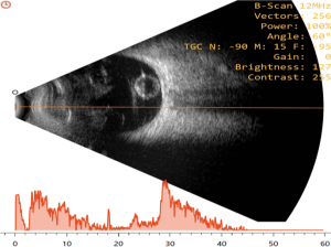 Conventional ophthalmic ultrasonography (USG) uses a probe that oscillates between 7.5 – 12 Mega Hertz. Diagnostic ophthalmic ultrasonography may employ either a unidirectional amplitude modulated (A scan), first reported in 1956 by Mundt and Hughes and the two-directional cross-sectional brightness (B scan) scan, introduced in ophthalmic practice by Baum and Greenwood in 1958. Frequently, both the A-scan and B-scan complement each other and are often used together.It is non-invasive, non-ionizing, inexpensive, and easily performed imaging technique. It is useful in detecting intraocular foreign bodies (IOFB) and outlining soft tissue abnormalities of the eye and orbit in presence of media opacity.[3] It is relatively contraindicated in the presence of open globe injury, to avoid further trauma and wound contamination. Thus, in case of a ruptured globe, it is highly recommended that primary closure should be performed prior to ultrasound examination. If ultrasound examination is performed prior to primary closure, it should be performed with caution to minimize possible trauma to the eye. Sterility is essential if the globe is open or a wound has been recently closed. The probes should be sterile, or they may be placed in sterile rubber sleeves.[4]