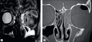 As a brief overview, the extension of sinus infections into the orbit region is characterized by early thickening of the medial rectus, followed by involvement of other extraocular muscles1. Bone erosion of the lamina papyracea and orbital walls, stretching and thickening of the optic nerve, and spread of soft tissue inflammation to the orbital fissures and apex can show worsening of the condition. Cavernous sinus infection would present with altered intensity of the cavernous sinus on MRI. An MRI can also assess for lobar involvement, namely the basifrontal and temporal lobes, and large vessel narrowing.