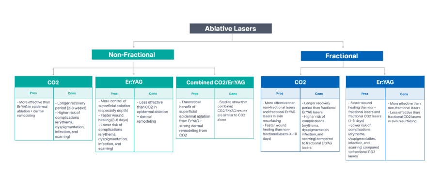 Non-fractional ablative lasers can be further distinguished by the type of laser used: CO2, Er:YAG, or combined CO2/Er:YAG lasers.