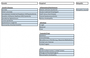LSCD has been associated with PAX6 gene mutations, which are also implicated in aniridia[4] and Peter’s Anomaly.[5] Other genetic disorders that have been reported with LSCD include ectrodactyly-ectodermal-dysplasia-clefting syndrome[6], keratitis-ichthyosis-deafness (KID) Syndrome[7], Xeroderma Pigmentosum[8], Dominantly Inherited Keratitis[9], Turner Syndrome[3] and Dyskeratosis Congenita.[10]