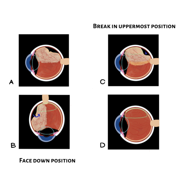 The bubble then rolls towards the break, pushing the subretinal fluid away from the macula back into the vitreous area and flattening the retina (D).