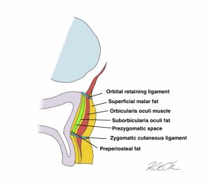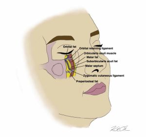 General Anatomy of Midface Malar region: When discussing physical characteristics arising from malar descent, it is important to understand the anatomy of the lower eyelid and cheek. There are two anatomical regions that are responsible for providing structural support, including the junction between the eyelid and cheek, as well as the midcheek. More specifically, the lid-cheek junction is located at the orbital rim, where the orbitalmalar ligament is visualized. It should be noted that the orbitalmalar ligament provides the separation between the lower eyelid and malar eminence, and is marked as the upper border where festoons generally develop.[1] Conversely, the lower border is within the midcheek, including both the malar septum and zygomaticocutaneous ligament where festoons often develop.[1] The malar septum spans the region between the inferior orbital rim to where it inserts within the midcheek dermis. Underneath this region is supported by the zygomaticocutaneous ligament. Lastly, preperiosteal fat and suborbicularis oculi fat make up the two layers of fat within the prezygomatic space (Figure 1 and Figure 2).