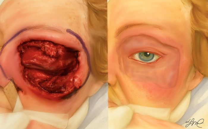 Necrotizing fasciitis (NF), although relatively uncommon, was first recognized by Hippocrates in the fifth century BC. [1] This disease is a severe infection characterized by a rapid and devasting progression involving the superficial fascia leading to skin necrosis. NF commonly affects the abdomen, extremities and perineum. It is associated with a high mortality rate of 25 – 30%.[2] NF has many names including: hospital gangrene, necrotizing erysipelas, flesh eating bacterial infection, and progressive bacterial synergistic gangrene. Periorbital NF, albeit uncommon due to its relatively uncompromised and robust blood supply, has a reported mortality of 8-15% and a rate of vision loss of 13.8%.[1][3]