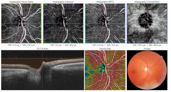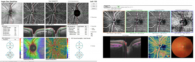 Figure 3 (above) shows the OCTA scan of the optic nerve of a healthy patient with Triton device. Triton scans the optic disc using a long-wavelength scanning light of 1050nm at a speed of 100000 A-scans per second. This device analyses different retinal slabs (or retinal depths): optic nerve, radial peripapillary capillary (RPC), vitreous, choroid, as seen in the figure. It provides a grayscale for each slab and a color image (density map) with the combination of all slabs. It also shows an eye fundus image and OCT B-scan. At the moment, this device presents only qualitative VD for the optic disc. This healthy subject has light grays in all slabs and a predominance of red colors, showing high VD.