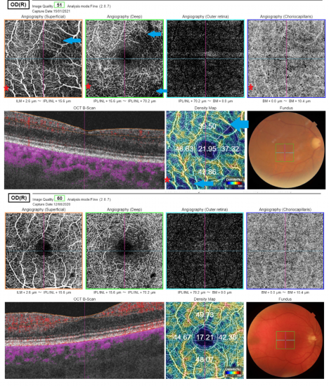 - ↑ Cennamo, G., et al., Optical Coherence Tomography Angiography Features in Post-COVID-19 Pneumonia Patients: A Pilot Study. Am J Ophthalmol, 2021. 227: p. 182-190.