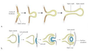 The homeobox gene Pax6 plays a crucial role in initiating eye development, which starts with the evagination of the optic grooves. During the fourth week of gestation, the optic grooves are transformed into optic vesicles upon neural tube closure. These optic vesicles contact the surface ectoderm and evolve into the optic cup, with the inner layer forming the retinal pigment epithelium, the middle layer forming the iris and ciliary body, and the outer layer developing into the retina. As the optic cup invaginates, the lens placode forms through the thickening of the ectoderm and eventually forms the lens vesicle upon separation from the ectoderm 6.