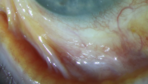 Pseudopemphigoid (Figure 3) is a cicatrizing conjunctivitis that mimics ocular mucous membrane pemphigoid in its presentation and requires a conjunctival biopsy to distinguish them. The largest publication to evaluate this disease was by Thorne et al. who showed that 28.3% of all cases of pseudopemphigoid were due to topical glaucoma medications (beta-blockers 87.8%, epinephrine and alpha-agonists 61%, miotics 53.6%).[28] Most of these cases were receiving multiple agents; hence, it was not possible to conclude which medications contributed to the presumed drug-induced pseudopemphigoid.