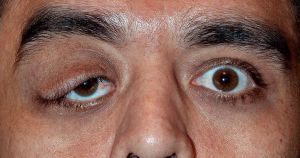 Plexiform neurofibromas are another characteristic symptom seen in patients with NF1. These are benign skin tumors that occur in less than 10% of patients with NF1, and they can involve the eyelid, eyebrow, orbit, and the temple[24]. These neurofibromas are soft and feel like “a bag of worms” upon palpation, and they present as a classic “S-shaped deformity” of the eyelid[5]. Consequences of these plexiform neurofibromas include proptosis, strabismus, amblyopia, congenital glaucoma, and skull deformities[3]. The lesions although benign can be extensive and cosmetically disfiguring[27]. Sphenoid wing dysplasia, an osseous abnormality resulting in thinning or absence of the greater sphenoid wing and may be associated with plexiform neurofibromas affecting the orbit[3][24].