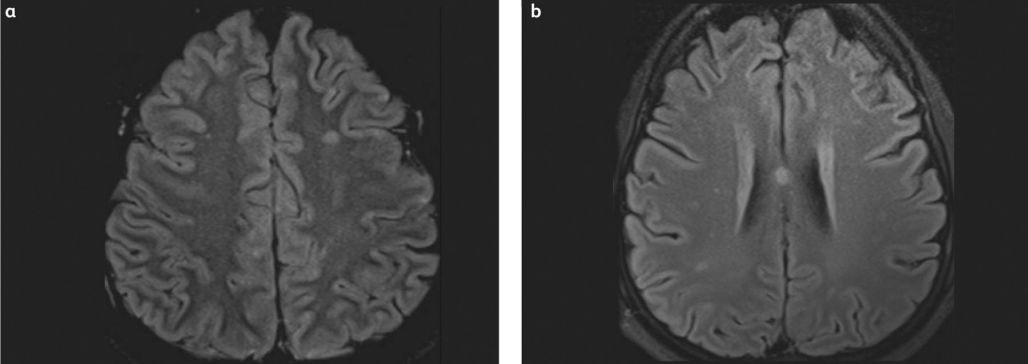 Magnetic resonance imaging (MRI) typically reveals multiple small (2 to 7 mm) hyperintense lesions (Figure 3) on T2-weighted images, most commonly located in the subcortical and deep white matter, periventricular regions, and corpus callosum.[5][14]