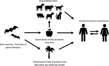 - Human infection can occur through ingestion of contaminated food (especially fruits and date palm sap contaminated with the bat’s bodily fluids), exposure to infected animals or their secretions, or person-to-person transmission via droplets or aerosols (Figure 2).[5]