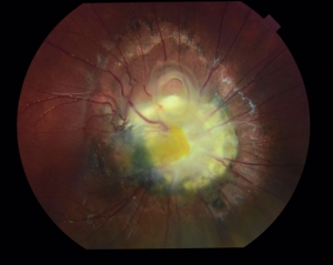 The ophthalmologic exam can reveal strabismus, amblyopia, and anterior and posterior segment anomalies. Anterior segment anomalies may include colobomas, iris hypoplasia, corneal opacity, and cataracts. Posterior segment anomalies include persistence of fetal vasculature, morning glory disc anomaly (Fig.1), optic nerve atrophy or hypoplasia, optic disc edema, and peripapillary staphyloma. Retinal hypervascularity and dysgenesis are other ocular findings in these patients. [3] [5] [17]