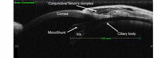 Batlle and colleagues[2] reported on three-year outcomes in a prospective study of 23 patients that underwent the procedure at a single site. Fourteen of the patients underwent standalone MicroShunt implantation and 9 patients underwent the procedure in combination with cataract surgery. Importantly, patients received MMC at a concentration of .4mg/mL for minutes intraoperatively. The study group defined complete and qualified surgical success using standard definitions where complete success required a postoperative IOP < 21 mmHg, reduction from baseline by >20%, no reoperation for glaucoma, no loss of light perception vision, and no hypotony defined as IOP <5 mmHg on 2 consecutive visits after 3 months as well as no use of supplemental medications. A qualified surgical success met these measures but required the use of supplemental medications. Among all patients, IOP was reduced from a baseline of 23.8+5.3 mmHg to 10.7+3.5 mmHg at 3 years postoperatively, representing a 55% reduction from baseline. The mean number of glaucoma medications per patient was reduced from 2.4+0.9 to 0.7+1.1 at 3 years postoperatively. A qualified surgical success rate (using a 14 mmHg rather than 21 mmHg threshold) was attained in 95% of patients at 3 years. Complications included transient hypotony in 3 patients and transient choroidal effusion in 2 patients. These events resolved spontaneously in all patients. One patient failed the procedure due to persistent elevation in IOP attributed to bleb encapsulation. Another patient required needling of an encapsulated bleb to regain IOP control and another patient experienced proximal tube obstruction with fibrin which was relieved with anterior chamber irrigation.