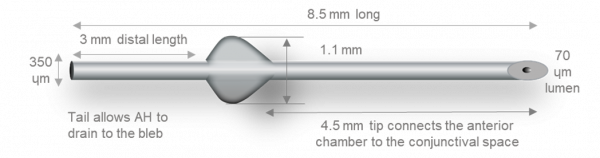 The device has a total length of 8.5 mm, which is divided by a 1mm “fin” into distal (3 mm) and proximal (4.5 mm) segments. The external lumen is 350um and the internal lumen is 70um with a beveled tip at the proximal end.
