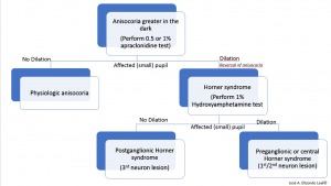 Hydroxyamphetamine may be used next to differentiate between a first- or second-neuron versus a third-order neuron lesion. Topical 1% hydroxyamphetamine may therefore distinguish between pre- and post- ganglionic lesions in the oculosympathetic pathway.[28]Hydroxyamphetamine leads to release of norepinephrine from the third-order neuron junction with the iris. Therefore, in the case of third-order neuron disorder, such as paratrigeminal neuralgia, the pupil of the affected eye would fail to dilate as well as the fellow, control, normal pupil. Equal dilation of the pupils after hydroxyamphetamine testing (in a cocaine or apraclonidine confirmed Horner syndrome) would be suggestive of a first or second-order neuron disorder (Figure 3 and 4). Many authors have recommended abandoning pharmacologic testing and proceeding with neuroimaging of the entire oculosympathetic axis in patients with clinically diagnosed Horner syndrome due to the variable sensitivity and specificity of the topical pharmacologic testing.